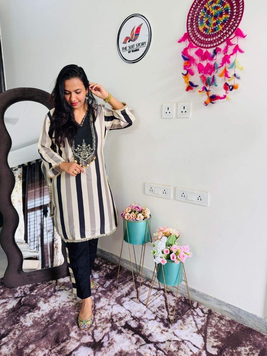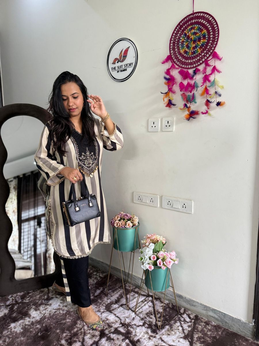 Bold Vertical Stripes, intricate Hand embroidery on the Yoke with pearl and Tassel Detailing.