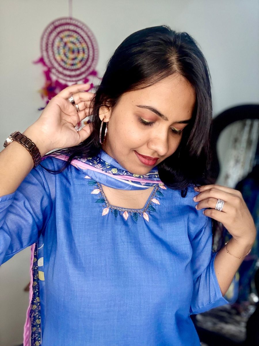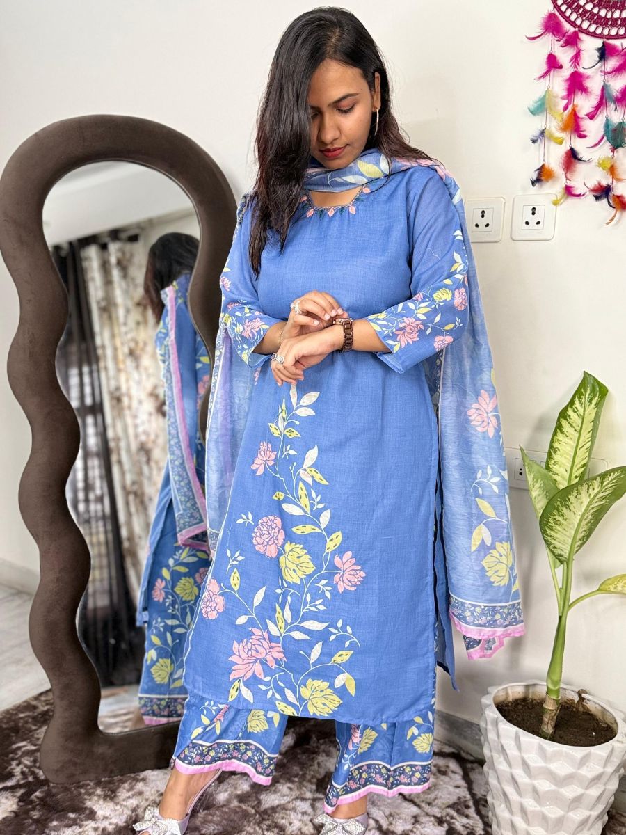 Suit with Mul Cotton lining attached. Digital flower print Thread work embroidery and sequence work.