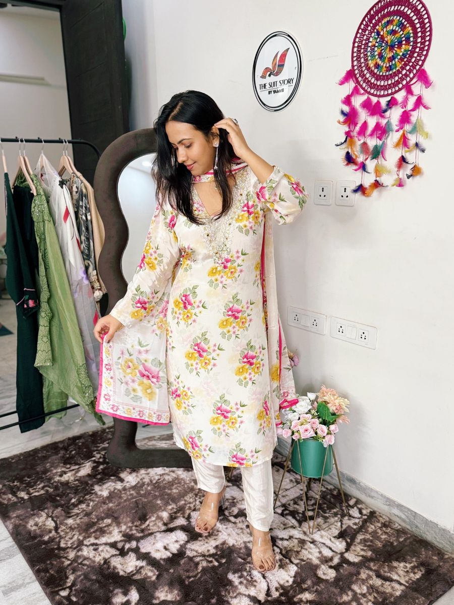 Pure Crepe Suit with cotton lining Attached. Pearl work detailing with embroidery on the neckline.