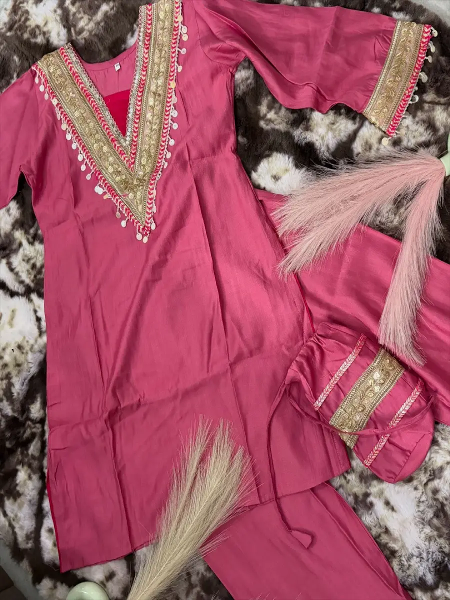 Roman Silk Fabric with Gota and Tassel Detailing on the Yoke along with a beautiful little Potli with same Lace and Gota Detailing.