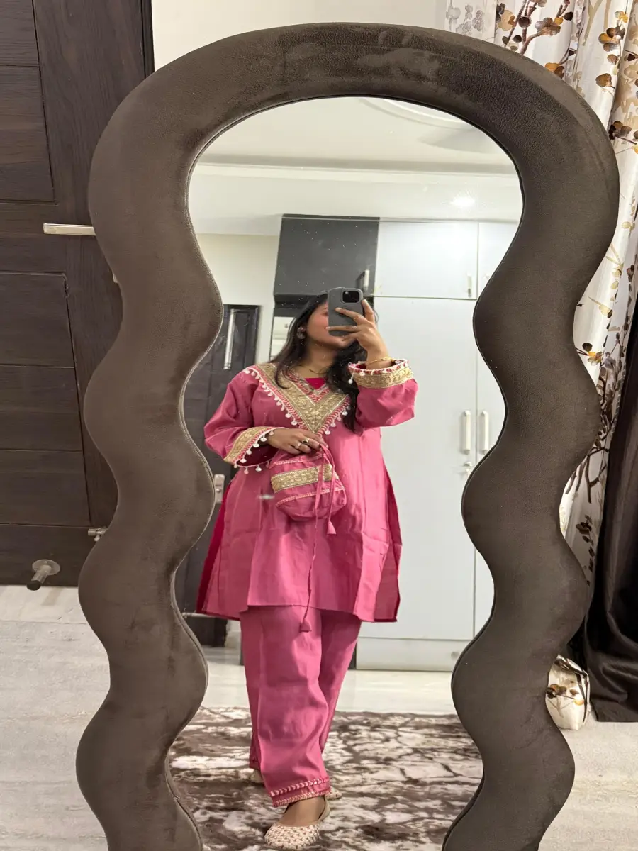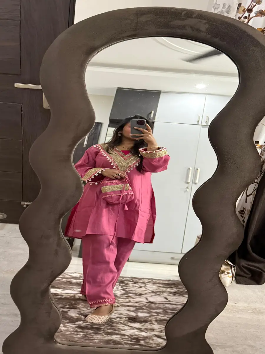 Roman Silk Fabric with Gota and Tassel Detailing on the Yoke along with a beautiful little Potli with same Lace and Gota